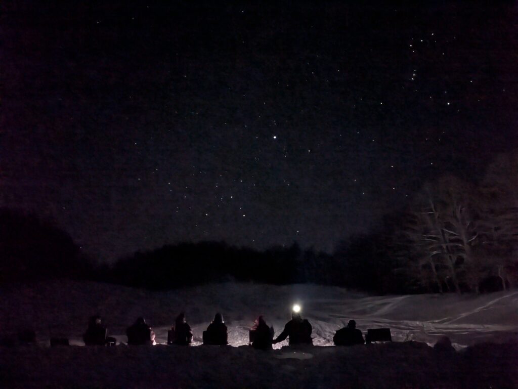 秋冬:ヒュッテ前のゲレンデに移動~雪原に寝転がってキラキラ輝く星空をたっぷり観賞~山荘へ戻って終了。